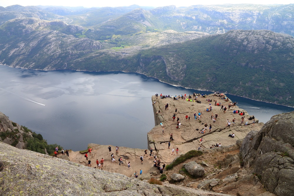 そして、ここに辿りつく方法はたったひとつ、歩くこと。登りの道を片道約2時間ほど歩くと、急に視界が開け、フィヨルドの大パノラマが目に飛び込んできます。下りの道もここを下るわけですが、岩場や鎖場もあるので雨などが降ると滑りやすくなり危険です。じゃあ、いつ行けばいいのか。4月から10月半ばまでがここに立ち入ることのできるシーズンであり、また春も朝霜が降りたりするので、ベストな時期はやはり夏でしょう。実際に縁ぎりぎりのところで座っていたら誤って転落した、という例もあるので観光とはいえ細心の注意が必要だと言えます。