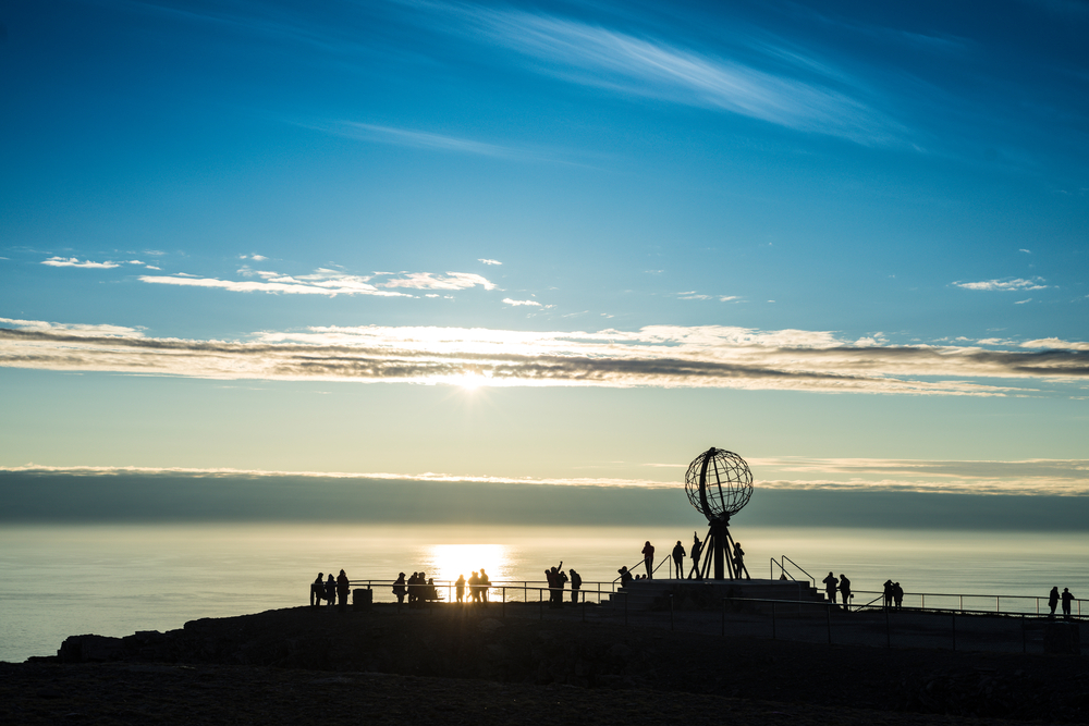 ノールカップは高さ307mの断崖で、北緯71度10分21秒、東経25度47分40秒に位置していて、北極点からは2,102.3kmの距離にあります。夏の夜の白夜の時期は岬から延々と続く水平線の上をなぞるようにして沈まない太陽が動いていきます。