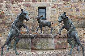 メルヘンの泉には、おおかみと子ヤギたちの銅像があります。木組みの家々や石畳の小道はまさにメルヘンの世界!