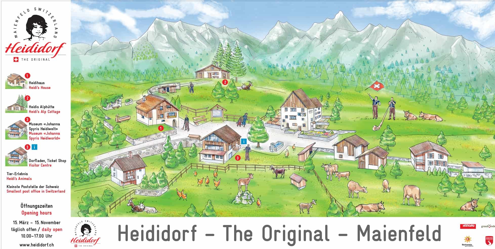 鉄道にてハイジの故郷マイエンフェルトへ日帰りの旅 所要時間:約10分 / 直通 マイエンフェルト ヨハンナ・シュピリ著「ハイジ」の故郷マイエンフェルト。リヒテンシュタインとオーストリアとの国境近くにある小さな村です。大河になる前のライン川沿いの町で、美しい葡萄畑が広がっています。 ハイジ村(ハイジドルフ) マイエンフェルト駅から約2.4キロ、徒歩約40分。ハイジドルフ内には、ハイジの家を再現したハイジハウスや、ヨハンナ・シュピーリミュージアム、土産店、スイスで一番小さな郵便局、ハイジの山小屋(ハイジヒュッテ)などがございます。ハイジドルフは、2026年のシーズンは3月13日~11月1日の毎日10時から17時オープン。最終入場15:45まで。 ハイジドルフから約500m、徒歩約10分の場所に、ハイジホフという名のホテル・レストランがあり、ボリューム満点の地元の料理を楽しめます。 ハイジ村の日本語パンフレット https://www.heididorf.ch/fileadmin/siteadministration/prospekte/Heididorf_Brochure_in_Japanese.pdf ハイジ村公式ウェブサイト https://www.heididorf.ch/en/ お好きな時間に鉄道でクールに戻ります。 |