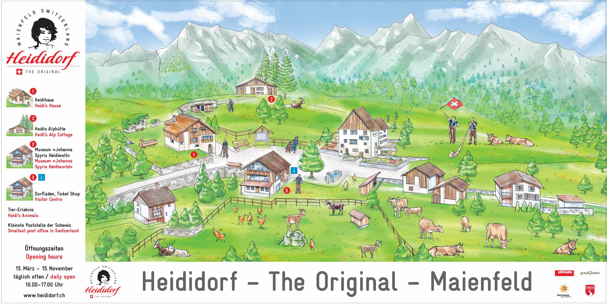 鉄道にてハイジの故郷マイエンフェルトへ 所要時間:約5分 / 直通 ★駅から徒歩でハイジの村(ハイジドルフ)へ 小さなマイエンフェルト駅前からのびるバーンホフ(Bahnhof)通りにインフォメーションセンター・ハイジショップがございます。ここから始まるハイジの小路(Heidi Weg)を辿り、マイエンフェルトの村の路地や葡萄畑の横を通りながら、2.5キロ、徒歩約45分~でハイジの村に到着します。 ハイジの村 HEIDI DORF 10:00 a.m. ~ 5:00 p.m.ハイジの家を再現したハイジハウスや、夏の山小屋(ハイジヒュッテ)、村の学校、ヨハンナ・シュピーリ博物館、土産店、スイスで一番小さな郵便局などがございます。2026年は3月13日~11月1日に毎日開館。 昼食は、ハイジの村近くのHotel Restaurant Heidihofでボリューム満点の地元の料理とワインはいかがでしょうか? ハイジの小路(Heidi Weg)周回ハイキングコース 所要時間:約1時間半~2時間駅からハイジの小路(ハイジヴェーグ)をたどりながらマイエンフェルト村をぐるっと一回りするハイキングコースです。途中にハイジの村やレストラン・ハイジホーフ、ハイジの泉がございます。 お好きな時間に鉄道でバートラガッツに戻ります。 |